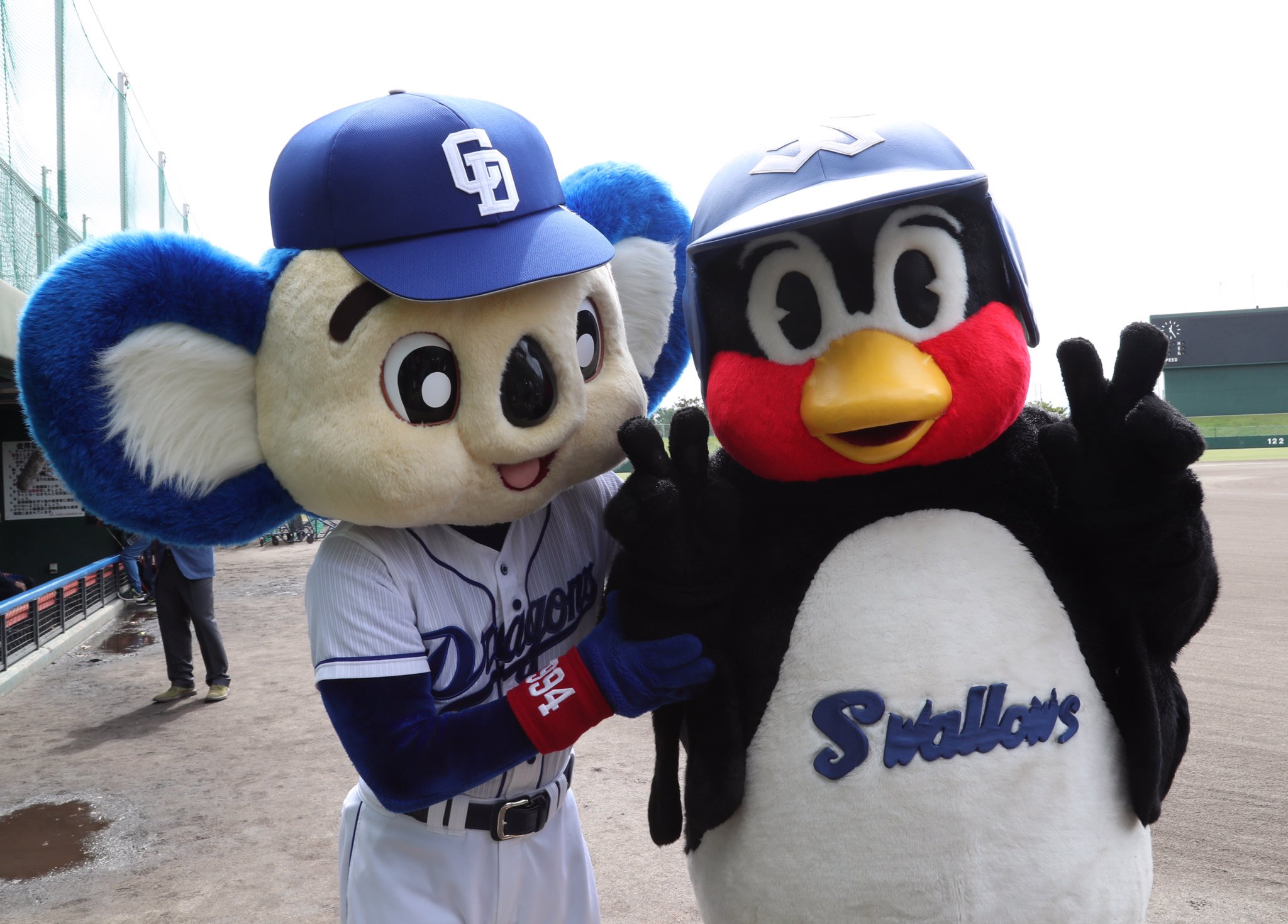 中日スポーツ 久々のツーショットです 4月7日神宮球場で行われる25周年イベントにドアラを招待するため つば九郎が北谷球場を訪れました 谷沢昇司撮影 中日ドラゴンズ ドラゴンズ ドアラ つば九郎 ヤクルト ヤクルトスワローズ